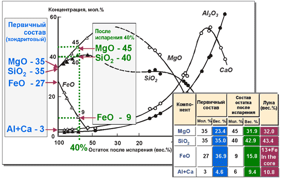 Тогда отчетливо выявляется обедненность Луны не только железом, но и кремнием и магнием. Исходя из экспериментальных данных, этого следовало ожидать при существенной потере железа в процессе испарения.