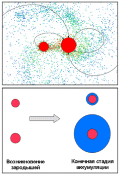 Рис. 8 – Компьютерное моделирование показывает, что больший из образовавшихся зародышей (красный цвет) развивается гораздо быстрее и аккумулирует большую часть оставшегося исходного облака частиц (синий цвет).