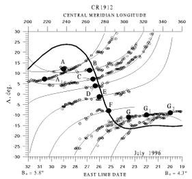 Рис. 3. Часть синоптической карты CR1912. Толстая сплошная линия - нейтральная линия.
