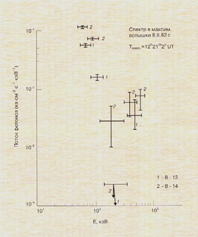 Рис. 5 Солнечная гамма-вспышка. Спектр гамма-излучения, полученный одновременно аппаратурой с космических кораблей "Венера - 13"(1) и "Венера - 14" (2). Хорошо видно, что в районе энергий квантов 0,4 - 0,6 МэВ нарушается обычный (степенной) вид спектра гамма-излучения. Это связанно с "включением " другого механизма генерации гамма-квантов.