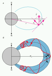 Ограничения (3) и (4) удовлетворяют условиям адиабатичности. При их выполнении задача о движении заряженной частицы в магнитном поле решается просто, а величины Rл и Tл определяются достаточно точно. Например, для электрона и протона с энергией 10 МэВ ларморовские радиусы составляют соответственно 12,2 и 118 км, а периоды их вращения ~10-6 и ~10-3 с. Конечно, ларморовский радиус частиц должен быть гораздо меньше радиуса Земли. Это нужно для выполнения условий адиабатичности (для чего достаточно соотношения Rл/Rз