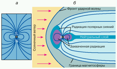 Наклон и смещение оси диполя по отношению к оси вращения, а также величина магнитного момента определяют лишь общую картину магнитного поля Земли. На малых расстояниях от Земли поле несколько искажается под влиянием магнитных аномалий: Бразильской, Южноатлантической, Северной и др. На расстояниях же более 6-7 радиусов Земли оно существенно искажено солнечным ветром (магнитным полем, вмороженным в плазму солнечного ветра). На рис. 1 представлена картина пространства, занимаемого магнитным полем Земли и называемого магнитосферой.