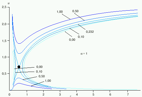 , что удовлетворяет условиям модели. Таким образом, на больших расстояниях от Солнца физический смысл имеет лишь верхняя ветвь решения уравнения Паркера.