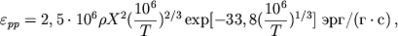 -квант. В результате перечисленных процессов 1,0078 г водорода переходит в 1,0000 г гелия, а оставшаяся масса превращается в кинетическую энергию частиц и энергию радиации. Скорость выделения энергии в ходе реакций протон-протонного цикла определяется выражением