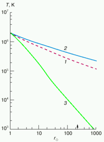 Следует заметить, что одножидкостные модели гидродинамики применимы в физике плазмы лишь в том случае, когда частота столкновений электронов с ионами достаточно велика, что обеспечивает эффективный обмен импульсом между электронной и ионной компонентами плазмы и соответственно равенство их температур. P.A. Sturrock и R.E. Hartle (1966 год) обратили внимание на то, что в солнечном ветре вследствие быстрого убывания плотности плазмы с расстоянием от Солнца последнее условие может не выполняться и температура ионов может существенно отличаться от температуры электронов. При этом, поскольку ионная теплопроводность относительно мала, протонная компонента короны Солнца расширяется почти адиабатически и соответственно быстро охлаждается. В то же время теплопроводность электронной компоненты плазмы относительно велика, в связи с чем температура последней падает с расстоянием достаточно медленно, что в целом не противоречит экспериментальным данным (см. табл. 1).