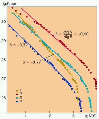 Оценки энергии вспышек в [4] показывают, что распределения их интегральных по времени значений энергий могут быть представлены степенной функцией