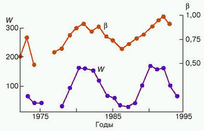 интегрального энергетического спектра рентгеновских вспышек в течение двух циклов солнечной активности (W - числа Вольфа).