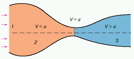 В бак 1, называемый ресивером, с очень маленькой скоростью подается газ, нагретый до очень высокой температуры (внутренняя энергия газа много больше его кинетической энергии направленного движения). Путем геометрического поджатия канала газ ускоряется в области 2 (дозвуковое течение) до тех пор, пока его скорость не достигнет скорости звука. Для дальнейшего его ускорения необходимо канал расширять (область 3 сверхзвукового течения). Во всей области течения ускорение газа происходит за счет его адиабатического (без подвода тепла) охлаждения (внутренняя энергия хаотического движения переходит в энергию направленного движения).