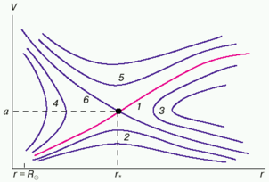 При заданном распределении температуры Т система уравнений (2) и (4) имеет решения типа представленных на рис. 1. На этом рисунке через a обозначена скорость звука, а r* - расстояние от начала координат, на котором скорость газа равна скорости звука (V = a). Очевидно, что только кривые 1 и 2 на рис. 1 имеют физический смысл для проблемы истечения газа из Солнца, поскольку кривые 3 и 4 имеют неединственные значения скорости в каждой точке, а кривые 5 и 6 соответствуют очень большим скоростям в солнечной атмосфере, что не наблюдается в телескопы. Паркер проанализировал условия, при которых в природе осуществляется решение, соответствующее кривой 1. Он показал, что для согласования давления, получаемого из такого решения, с давлением в межзвездной среде наиболее реален случай перехода газа от дозвукового течения (при r r*), и назвал такое течение солнечным ветром. Однако это утверждение оспаривалось в работе [3] Чемберленом, который полагал наиболее реальным решение, соответствующее кривой 2, описывающей всюду дозвуковой "солнечный бриз". При этом первые эксперименты на космических аппаратах (см., например, [4]), обнаружившие сверхзвуковые потоки газа от Солнца, не казались, судя по литературе, Чемберлену достаточно достоверными.