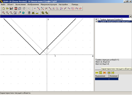 Щоб побудувати графік функції у = │х + 1│ за допомогою програми GRAN-2D потрібно, використовуючи послугу «Створити» – «Графік функції» пункту «Об'єкт», увести функцію Y(X)=Abs(X+1), вибрати необхідний тип залежності функції (явна, параметрична чи в полярних координатах), колір, тип та товщину лінії, і натиснути команду «Застосувати». Після цього з'явиться таке зображення графіка (рис.2):