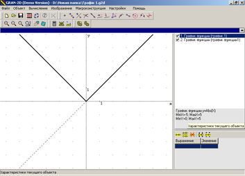 Для побудови графіка функції у = │х│ за допомогою програми GRAN-2D потрібно, використовуючи послугу «Створити» – «Графік функції» пункту «Об'єкт», увести функцію Y(X)=Abs(X), вибрати необхідний тип залежності функції (явна, параметрична чи в полярних координатах), колір, тип та товщину лінії, і натиснути команду «Застосувати». Після цього повинно з'явитися зображення (рис. 1):