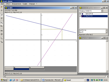 графічним способом за допомогою програми GRAN1 потрібно, використовуючи послугу «Створити» пункту «Об'єкт», увести такі рівняння X+3*Y-9=0, 2*X-Y-4=0, вибрати неявний тип залежності та колір лінії, і натиснути команду «ОК». Після цього повинно з'явитися таке зображення (рис. 6):