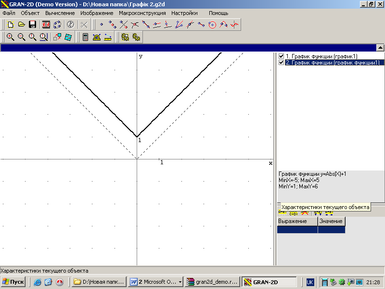 Для побудови графіка зазначеної функції за допомогою програми GRAN-2D потрібно, використовуючи послугу «Створити» – «Графік функції» пункту «Об'єкт», увести функцію Y(X)=Abs(X)+1, вибрати необхідний тип залежності функції (явна, параметрична чи в полярних координатах), колір, тип та товщину лінії, і натиснути команду «Застосувати». Після цього повинно з'явитися таке зображення графіка (рис. 3):
