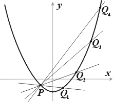 Для кривых малого порядка d картина следующая: при d = 1 имеем прямую и на ней бесконечно много рациональных (и даже целых) точек; при d = 2 получается квадрика (эллипс, парабола, гипербола); на квадрике либо совсем нет, либо бесконечно много рациональных точек 2. Это доказывается тем же геометрическим методом, который выше был применён для нахождения рациональных точек на единичной окружности и который, согласно данным Башмаковой, также восходит к Диофанту ([1], § 5). И именно, прямая с рациональным угловым коэффициентом, проходящая через рациональную точку P квадрики, пересекает её в рациональных точках. Поворачивая прямую вокруг точки P, получаем бесконечно много рациональных точек (рис.5).