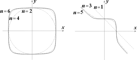 Рассмотрев на евклидовой плоскости кривую Fn, заданную этим уравнением, получим две качественно различные возможности в зависимости от чётности или нечётности n (см. рис.4). Кривая Fn называется кривой Ферма порядка n. Поэтому гипотеза Ферма означает, что на кривой Fn порядка выше 2 единственными рациональными точками (т.е. точками с рациональными координатами) являются точки пересечения с осями координат.