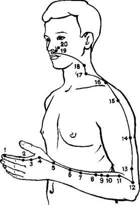 Рис. 2. Схема наружного хода меридиана толстой кишки: 1 — шан-ян, 2 — эр-цзянь, 3 — сань-цзянь, 4 — хэ-гу, 5 — ян-си; 6 — пянь-ли; 7 — вэнь-лю, 8 — ся-лянь, 9 — шан-лянь, 10 — шоу-сань-ли; 11 — цюй-чи, 12 — чжоу-ляо, 13 — шоу-у-ли, 14 — би-нао, 15 — цзянь-юй, 16 — цзюй-гу, 17 — тянь-дин, 18 — фу-ту, 19 — хэ-ляо, 20 — ин-сян