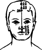 Глубина укола около 0,5 — 1,0 см, направление укола почти горизонтальное, конец иглы книзу; прижигание 2 — 5 мин.