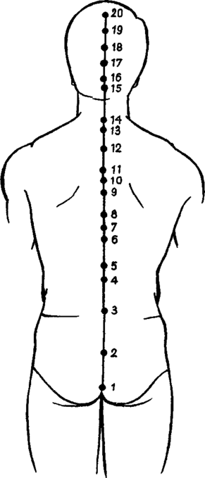 Рис. 13. Схема наружного хода заднесрединного меридиана: 1 — чан-цян, 2 — яо-шу, 3 — яо-ян-гуань, 4 — мин-мэнь, 5 — сюань-шу; 6 — цзи-чжун; 7 — чжун-шу, 8 — цзинь-со; 9 — чжи-ян, 10 — лин-тай; 11 — шэнь-дао; 12 — шэнь-чжу, 13 — тао-дао, 14 — да-чжуй; 15 — я-мэнь; 16 — фэн-сру, 17 — нао-ху, 18 — цянь-цзянь, 19 — хоу-дин, 20 — бай-хуэй, 21 — цянь-дин; 22 — синь-хуэй; 23 — шан-син; 24 — шэнь-тин; 25 — су-ляо, 26 — жэнь-чжун, 27 — дуй-дуань, 28 — инь-цзяо (на уздечке верхней губы)