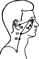 глаза и к уху, где заканчивается в точке IG19 тин-гун.