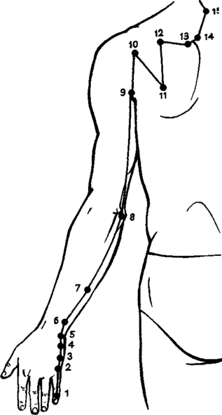 Рис. 6. Схема наружного хода меридиана тонкой кишки: 1 — шао-цзэ, 2 — цянь-гу, 3 — хоу-си, 4 — вань-гу, 5 — ян-гу, 6 — ян-лао, 7 — чжи-чжэн, 8 — сяо-хай, 9 — цзянь-чжэнь, 10 — нао-шу, 11 — тянь-цзун, 12 — бин-срэн, 13 — цюй-юань, 14 — цзянь-вай-шу, 15 — цзянь-чжун-шу, 16 — тянь-чуан, 17 — тянь-жун, 18 — цюань-ляо,19 – тин-гун