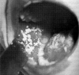 или инфекционных заболеваний. Начинается стоматит с сухости и гиперемии слизистых оболочек, потери аппетита, небольшого ухудшения общего состояния. При первичном стоматите осмотр полости рта выявляет творожистые белые или кремовые наложения, располагающиеся на слизистой оболочке щек (рис. 144), десен, твердого и мягкого неба (рис. 145), внутренней поверхности губ. При вторичном стоматите поражения более глубокие и наложения на слизистой оболочке полости рта более толстые и плотные, чем при первичном процессе; отмечаются эрозии и изъязвления слизистой оболочки. В части случаев стоматит проявляется только гиперемией слизистой оболочки полости рта без инфильтративной реакции. У некоторых больных стоматиты приобретают форму язвенного процесса с поражением твердого неба и становятся причиной генерализованного кавдидоза.