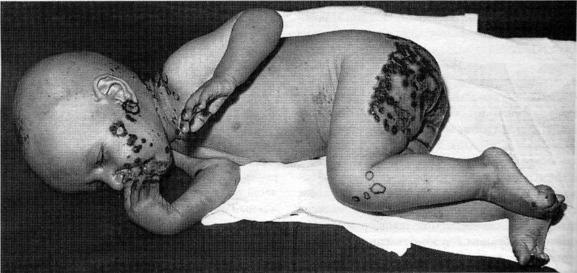 Рис. 149. Кандидозная инфекция. Поражение лица, ягодичной области, кистей рук и стоп.