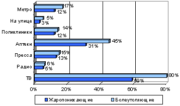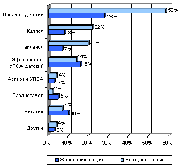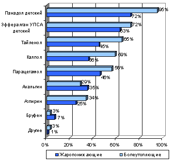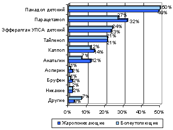 Многие существующие на рынке препараты обладают как жаропонижающим, так и болеутоляющим действием. Однако часто они позиционируются производителем или воспринимаются потребителями только как жаропонижающее или только как болеутоляющее средство. Для получения наиболее полной информации, вопросы о жаропонижающих и болеутоляющих препаратах задавались отдельно (диагр. 5).