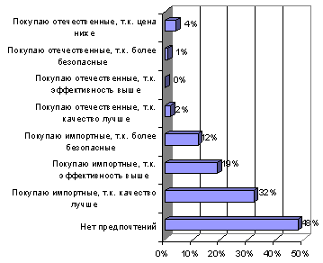 При ответе на более конкретный вопрос о том, какому средству, отечественному или импортному, респонденты отдадут предпочтение в случае их одинаковой стоимости и одинаковых показаний, количество безразличных заметно уменьшилось, а количество отдающих предпочтение российским средствам несколько увеличилось.