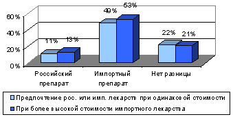Кроме того, уточнение вопроса о цене препаратов (когда цена импортного лекарства несколько выше аналогичного отечественного), не отразилось на картине предпочтений, что видно на диаграмме 2.