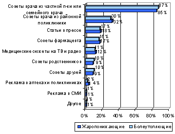 Что касается источников информации, которым респонденты доверяют при выборе детских препаратов, наибольшее доверие вызывают советы врача из частной/ведомственной поликлиники или семейного врача (в среднем — у 86% женщин). Мнение врача из районной поликлиники не вызывает такой однозначной реакции: всего треть опрошенных прислушались бы к его советам. В отдельную группу можно выделить информационные статьи в прессе и советы фармацевта в аптеке (около 17% респондентов отнеслись бы к ним с доверием). И, наконец, медицинские сюжеты в программах телевидения и радио, а также рекомендации родственников и друзей влияют на выбор лекарств только у 10% матерей (диагр. 8).