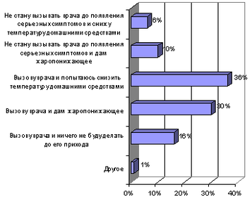 В большинстве случаев в ситуации, когда у ребёнка поднимается температура, матери вызывают врача, но до его прихода обязательно дают либо жаропонижающее лекарство (30%), либо снижают температуру какими-то домашними или народными средствами (36%). Очень небольшой процент респондентов ничего не предпринимает до прихода врача (16%). Столько же предпочитают самостоятельное лечение ребёнка без вызова врача до появления более серьёзных симптомов (16%) (диагр. 3).