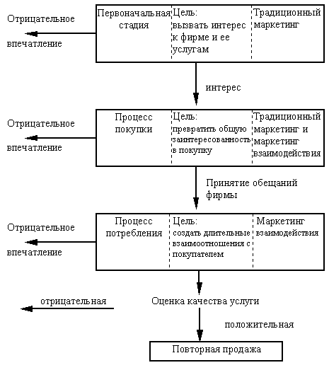 Когда покупатель ознакомился с предложением фирмы, он вступает на вторую стадию жизненного цикла взаимоотношений, то есть в процесс покупки. В этот момент покупатель оценивает предлагаемую услугу и сравнивает со своим представлением о том, что он ищет и сколько он готов за это заплатить. Задача сервисной фирмы на этом этапе - превратить общую заинтересованность клиента в реальную продажу. Предприятие дает конкретные обещания о своих обязательствах перед покупателем в надежде на то, что они приняты. И здесь уже могут быть использованы не только мероприятия традиционного маркетинга, но и маркетинг взаимодействия: ведь потенциальный покупатель приходит в фирму, встречается с ее работниками видит ее оборудование и знакомится с системой обслуживания еще до того, как он принял окончательное решение о покупке. Насколько благоприятное впечатление произведет это непосредственное знакомство покупателя с возможностями фирмы, зависит от эффективности организации и управления маркетингом взаимодействия.