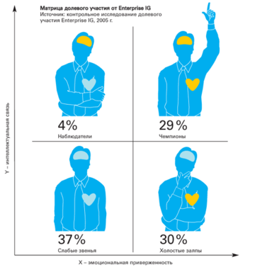В общем, снижайте оценку. В средней компании соотношение служащих такого типа, которых называют «чемпионами», составляет менее одного к двум служащим других типов. Некоторые служащие – «холостые залпы» – могут разделять устремления компании, но не знают, что нужно делать. Другие – «наблюдатели» – знают, к чему стремится компания, но не разделяют ее ценностей. А еще один тип – «слабые звенья» – и не знают, что нужно делать, и не разделяют ценностей компании. Но хуже всего то, что в средней компании такие «слабые звенья» составляют самую обширную группу – почти 40% (контрольное исследование Enterprise IG долевого участия более чем 75 тыс. служащих разных звеньев и секторов экономики).