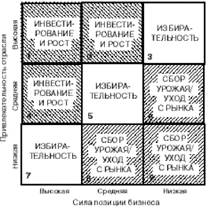 Индекс силы позиции определяется с учетом показателя относительной рыночной доли, динамики ее изменения, величины получаемой прибыли, имиджа, степени конкурентности цены, качества продукта, эффективности сбыта, географических преимуществ рынка, эффективности работы сотрудников. Возможно взвешивание используемых показателей. Принято три уровня градации данного индекса: сильная, средняя, слабая. Индекс привлекательности отрасли определяется с учетом размера и разнообразия рынков, скорости роста рынка, числа конкурентов, среднеотраслевой величины прибыли, цикличности спроса, структуры отраслевых затрат, ценовой политики, законодательства, трудовых ресурсов. Используется три уровня градации данного индекса: высокая, средняя и низкая. Пересечение линий, характеризующих различные уровни значений этих двух уровней, образует решетку, которая делится на три зоны: зону, в которую организация должна инвестировать; зону, в которой организация должна поддерживать инвестиции на прежнем уровне, и зону, в которой надо получить максимально возможную прибыль, после чего ее следует покинуть.