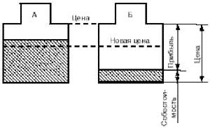 Предположим, что руководство организации Б, располагающее данной информацией, решило извлечь для себя выгоду из сложившейся рыночной ситуации. Что оно сделает? Снизит цену. Запас “экономической плавучести” у организации Б выше, чем у организации А, что позволяет провести большее снижение цены на продукт и характеризует более высокий уровень его конкурентоспособности.