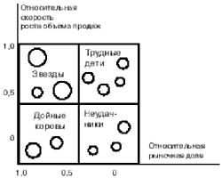 Пересечение этих двух координат образует четыре квадранта. Если продукты характеризуются высокими значениями обоих показателей, то они называются “звездами”, их следует поддерживать и укреплять. Правда, у “звезд” есть один недостаток: поскольку рынок развивается высокими темпами, то “звезды” требуют высоких инвестиций, таким образом “проедая” заработанные ими деньги. Если продукты характеризуются высоким значением показателя Х и низким — Y, то они называются “дойными коровами” и являются генераторами денежных средств организации, поскольку не требуется вкладывать средства в развитие продукта и рынка (рынок не растет или растет незначительно), но за ними нет будущего. При низком значении показателя Х и высоком — Y продукты называются “трудными детьми”, их надо специально изучать, чтобы установить, не смогут ли они при известных инвестициях превратиться в “звезды”. Когда как показатель Х, так и показатель Y имеют низкие значения, то продукты называются “неудачниками” (“собаками”, “догами”), приносящими или малую прибыль, или малые убытки; от них надо по возможности избавляться, если нет веских причин для их сохранения (возможное возобновление спроса, относятся к социально значимым продуктам и т. п.).