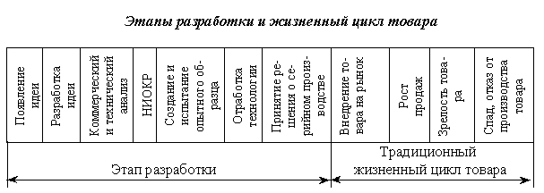 Рождение идеи нового товара (услуги), маркетинговые исследования (прогнозирование спроса на товар), прикладные исследования (проверка концепции нового товара на техническую осуществимость), проектирование, рыночные испытания (пробный маркетинг). Цель фирмы – проверить концепцию нового товара на предмет коммерческой реализуемости.