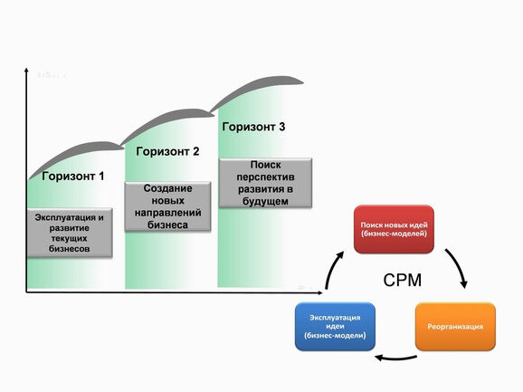 Первый из них получил название CPM (Corporate Performance Management) – управление стратегической эффективностью. Его задача - обеспечение быстрой перестройки организации, что измеряется показателями темпа вывода на рынок новых бизнесов (time to market). Организация, внедрившая СРМ становится способной к оперативной реализации принятых стратегий. Если не сделать это вовремя «кривая жизненного цикла» бизнеса пойдет вниз, а это означает что если за это время не будет выведен новый, то компания будет вынуждена уйти с рынка. Если же она ставит себе задачу не просто удержаться, а опережать конкурентов, то она получит новые возможности получения прибыли за счет уникального ценностного предложения, отсутствующего пока у других. (Для справки – жизнь производственной линии в высокотехнологичных отраслях около 2-лет, способы предоставления услуг могут меняться еще быстрее). Все это требует от компании работы над своими «динамическими способностями»: умения искать новые возможности внутри и вне компании, перестраивать свои бизнес-процессы, формировать новые.