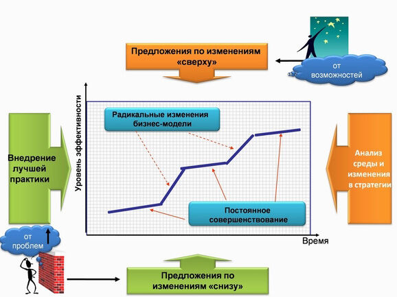 Таким образом, развитие и рост эффективности компании можно представить ступенчатым графиком. Резкие подъемы соответствуют реализации стратегических инициатив, запуску новых бизнесов или кардинальным улучшениям старых. Это контур СРМ. Для устоявших бизнесов происходит постоянный поиск возможностей повышения эффективности, поддерживается операционная философия непрерывного совершенствования, когда повышение эффективности процессов является делом каждого сотрудника. И это уже контур BPM.