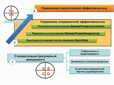 И каждый шаг вперед должен быть закреплен новой системой организационных регламентов, новым уровнем регулярного менеджмента. В японской методологии постоянного совершенствования «кайдзен» - это называется переход на цикл SDCA, в основе которого лежат стандартизированные процессы и процедурный контроль. Кроме того, в настоящее время, четкое исполнение процессов не только регулируются регламентами, но обычно контролируются специальными программами класса ВРМS (Business Process Management System).