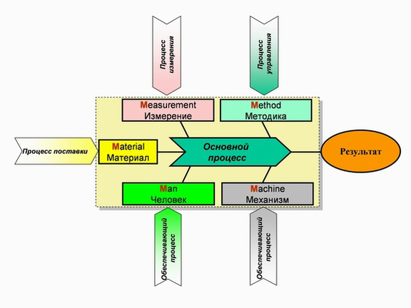 Вспомним диаграмму Ишикавы[13], определяющую факторы, влияющие на качество результата на выходе. Эту модель можно применять как для установления причин разовых отклонений, так и при планомерном поиске возможностей улучшения процессов. Для этого, кроме фактора, отнесенного к той или иной первичной группе (5М), следует определить и обеспечивающий процесс, результаты которого непосредственно влияют на данный фактор. Процесс, создающий конечный результат, всегда находится в системе других процессов (управление, измерение и контроль, поставки, обеспечения).