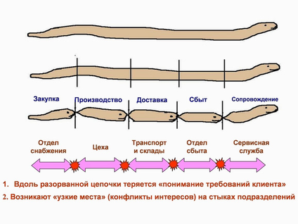 Гипертрофированное «разделение труда» привело к перекосам в организационных структурах, рассмотренной в предыдущей статье «департаментализации функций»[7]. Наибольший вред компании приносило превращение в такие крепости функциональных подразделений образующих, так называемую, «цепочку поставок»: маркетинг, проектирование, закупки, производство, сбыт. По этой линии происходило и происходит в компании взаимодействие с клиентом. Любая неэффективность такого взаимодействия сразу же отражается на способности компании к созданию конкурентоспособного ценностного предложения. «Переход к разделению труда и массовому производству привел к резкому снижению цены и к такому же падению качества»[8]. Разделенные «операции», подобно разрезанному на части червяку, зажили своей жизнью, руководствуясь собственными критериями эффективности.