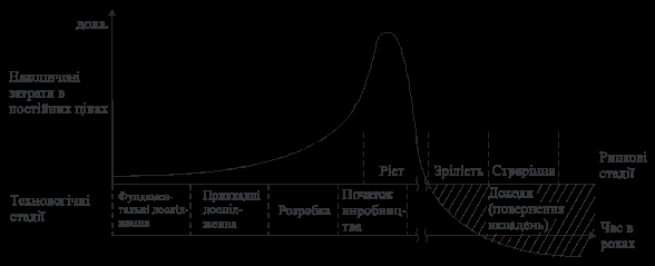 Кожен продукт має свій комерційний цикл, що, починається з вступу на ринок і закінчується відходом з його. Тривалість цього циклу має ряд наслідків для дослідницького процесу. По-перше, - це дохідна частина науково-виробничого циклу (якщо розглядати його в рамках кожної окремої продуктової програми), що є метою досліджень і джерелом нових дослідницьких зусиль, нового науково-виробничого циклу. По-друге, зовнішній вигляд продукту діє як годинник, що регулюють початок розробки нового продукту з метою підтримки виробництва. Усе це добре ілюструє Рис.1. На ньому сполучені стадії розробки продукту і його комерціалізації, на якій починають окупатися витрати. Період, що передує випускові продукції, є періодом найбільш активних НИОКР, а витрати ростуть експоненційно в ранній стадії проекту.