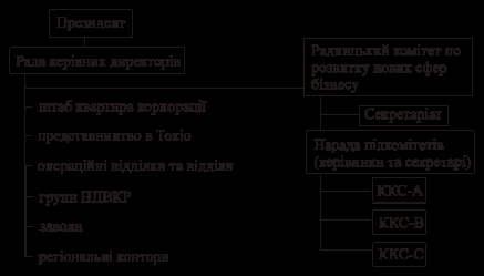 Керівництво групою здійснює генерального керівника і раду НДВКР, в який крім нього входять управляючі, відповідають за координацію науково-дослідних робіт в окремих ринково-продуктових областях (електроніка і електронні системи; електропроводи і кабелі; засоби зв'язку; органічні матеріали; метали, кераміка і т.п.) і контролюючі керівників дослідницьких підгруп, менеджери різних підрозділів групи НДВКР і керівники деяких проектних груп. Оцінка проектів НДВКР (цілком виконуваних тільки групою НДВКР), особливо крупно-масштабних і ризикованих, виробляється "дорадчим комітетом з розвитку нових сфер бізнесу" (kigyo kaihatsu committee - ККС), до складу якого входять голова ради директорів, президент, керівники функціональних відділів і виробничих відділень (ряс.5). Це тимчасовий орган, в його засіданнях беруть участь, як правило, лише ті керівники, до чиїх підрозділів безпосередньо відноситься оцінюваний проект. В рамках ККС функціонують три підкомітети: ККС-А займається якнайменше ризикованими проектами вдосконалення продукції, що випускається, в рамках структурних підрозділів компанії; ККС-В оцінює проекти розробки нових видів продукції в існуючих підрозділах; у ККС-С обговорюється майбутнє найбільш ризикованих проектів, пов'язаних з розробкою радикальних новин, упровадженням в нові для фірми сфери бізнесу і т.п.