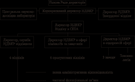 Складну матричну структуру НДВКР має друга за величиною хімічна компанія США "Дау Кемікл" (рис.6). Наявність в операційних підрозділах служб НДВКР свідчить про визнання керівництвом компанії важливості наближення інноваційної діяльності безпосередньо до процесу виробництва і збуту продукції. В той же час служби децентралізації НДВКР знаходяться в подвійному підпорядкуванні: лінійному керівнику виробничого підрозділу і директору НДВКР корпорації (зарубіжні служби) або директору НДВКР по операціях усередині США. У такій організаційній системі вплив керівника відділення на науково-технічну службу врівноважується впливом вищестоящого рівня управління НДВКР. Тим самим повинен забезпечуватися баланс ринкової орієнтації господарських операцій в цільовій спрямованості науково-технічної діяльності. В той же час лінійне керівництво відділень і виробничих відділів дістає можливість більш безпосередньо направляти науково-технічну і виробничо-господарську діяльність на меті ринкової конкуренції.