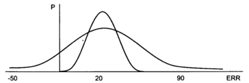 Очевидно, чем более "сжат" график, тем выше вероятность, соответствующая среднему ожидаемому доходу (ERR), и вероятность того, что величина реальной доходности окажется достаточно близкой к ERR. Тем ниже будет и риск, связанный с соответствующим проектом. Поэтому меру "сжатости" графика можно принять за достаточно корректную меру риска.