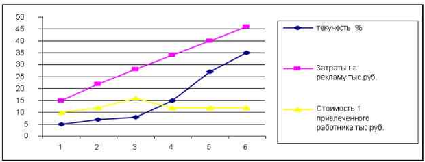 Проаналізувавши отримані результати можна зробити висновок про те, що, швидше за все реклама в даному випадку неефективна, і витрати на неї можна знижувати. Залучення персоналу через внутрішній найм, в даному випадку, дають позитивний ефект, що дозволяє понизити вартість одного привернутого фахівця.