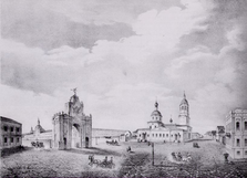 В литографии «свободного художника» Д. Струкова середины XIX века Красные ворота не просто «переигрывают» церковь Трех Святителей и Запасной дворец, но и подчиняют себе городское пространство, организуя движения «стаффажа» вокруг себя.