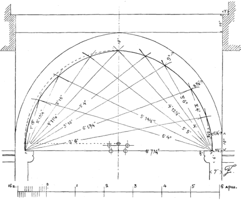 Произвести обмер было возможно. После ремонта внутри собора еще стояли леса, и одну из арок, а именно северную, я мог обмерить без затруднения и с достаточной точностью. Только по возвращении в Петербург, сделав по обмерам чертеж, я убедился, что глаза меня не обманывали (рис. 1).