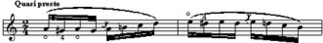Такую артикуляционную задачу мы сможем выполнить при исполнении нот на соседних струнах штрихом legato. Если при игре legato данная артикуляция появляется периодически, то при исполнении таких приемов, как bariolage и arpeggio, артикуляция с наплывом тонов осуществляется регулярно. Bariolage довольно часто встречается в скрипичной литературе. Напомним некоторые из них : Прелюдия из Партиты III И.С.Баха (пример 1) и Каприс No 24 Н.Паганини (пример 2).